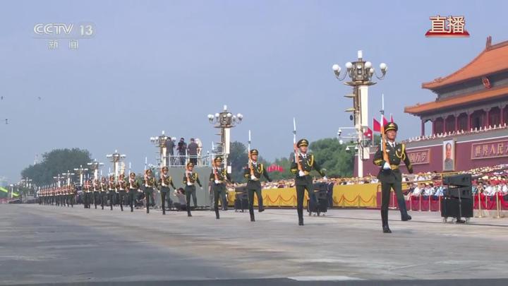 儀仗方隊(duì)護(hù)衛(wèi)黨旗、國(guó)旗、軍旗,3日上午第一個(gè)走過(guò)天安門(mén)廣場(chǎng),接受祖國(guó)和人民檢閱。儀仗方隊(duì)按照“9+12×17”隊(duì)形編組,由中國(guó)人民解放軍儀仗司禮大隊(duì)抽組而成。2022年10月,解放軍儀仗大隊(duì)與解放軍軍樂(lè)團(tuán)合并整編為中國(guó)人民解放軍儀仗司禮大隊(duì),成為唯一一支擔(dān)負(fù)國(guó)家級(jí)儀仗司禮任務(wù)的部隊(duì)。
