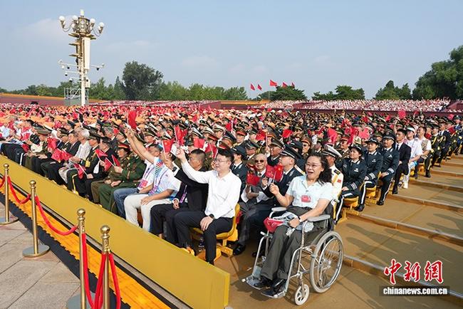 習(xí)近平同抗戰(zhàn)老戰(zhàn)士老同志代表親切握手,向他們表示崇高敬意。