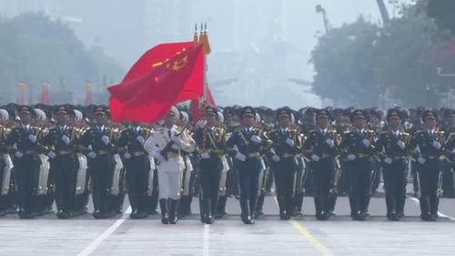 中國(guó)共產(chǎn)黨黨旗、中華人民共和國(guó)國(guó)旗、中國(guó)人民解放軍軍旗在受閱部隊(duì)最前方,習(xí)近平乘車(chē)行進(jìn)至黨旗、國(guó)旗、軍旗前,向旗幟行注目禮。