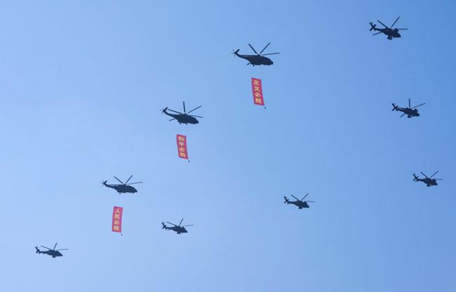 空中護(hù)旗梯隊(duì)3日上午飛過(guò)天安門(mén)廣場(chǎng)上空,拉開(kāi)了閱兵分列式帷幕?罩凶o(hù)旗梯隊(duì)由45架直升機(jī)組成。中國(guó)共產(chǎn)黨黨旗、中華人民共和國(guó)國(guó)旗、中國(guó)人民解放軍軍旗,各懸掛在1架直-20通用直升機(jī)正下方,分別由2架直-10武裝直升機(jī)組成左右僚機(jī)對(duì)其進(jìn)行護(hù)衛(wèi);26架直-19武裝直升機(jī)組成“80”字樣,寓意紀(jì)念中國(guó)人民抗日戰(zhàn)爭(zhēng)暨世界反法西斯戰(zhàn)爭(zhēng)勝利80周年;3架直-8L運(yùn)輸直升機(jī)分別懸掛“正義必勝”“和平必勝”“人民必勝”條幅,7架直-20T直升機(jī)圍繞標(biāo)語(yǔ)形成三角隊(duì)形,依次通場(chǎng)?罩凶o(hù)旗梯隊(duì)由陸軍牽頭組建。